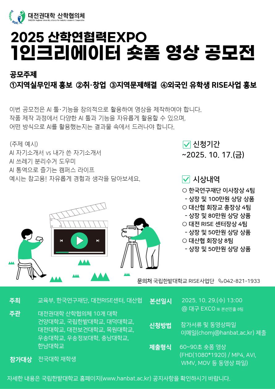 제목 | 2025 산학연협력 EXPO 1인크리에이터 숏폼 영상 공모전 참여 협조 요청 | ||||