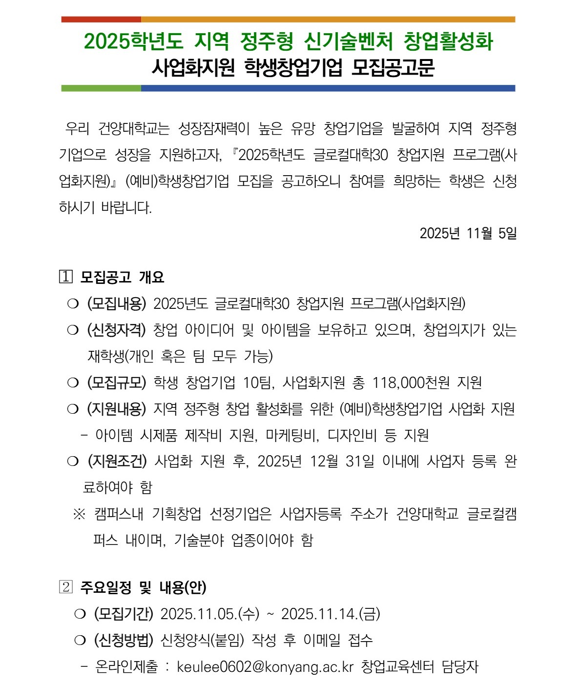 | 제목 | 2025학년도 지역 정주형 신기술벤처 창업활성화 사업화지원 학생창업기업 모집 공고 | ||||