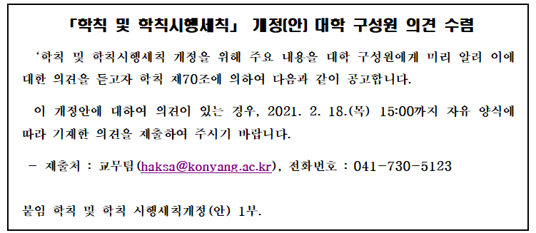 | 제목 | 학칙 및 학칙시행세칙(제26조 등) 개정(안) 대학 구성원 의견 수렴 안내 | ||||
