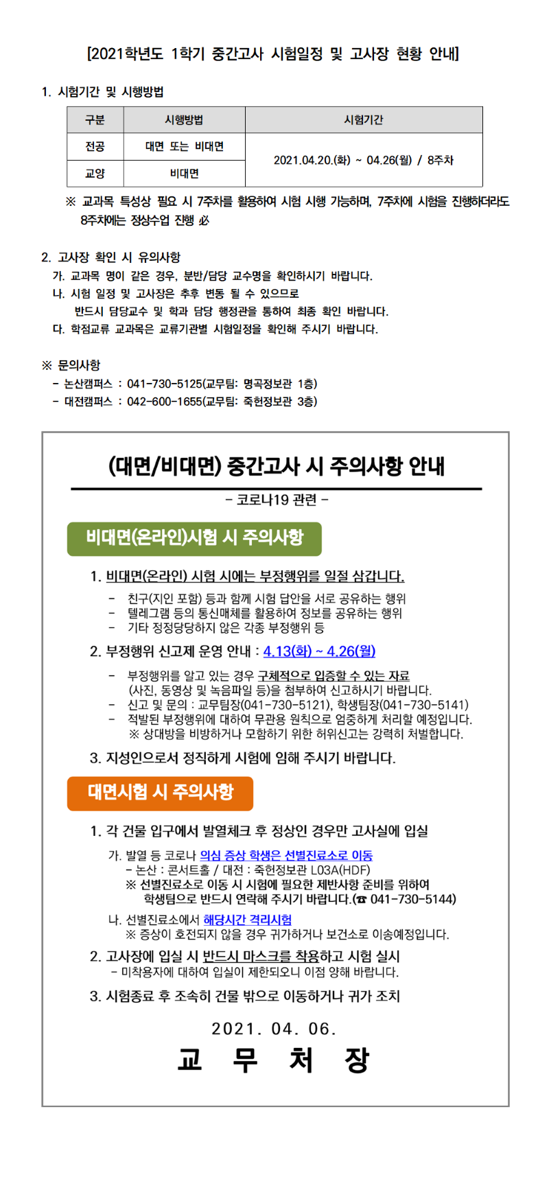 | 제목 | 2021학년도 1학기 중간고사 시험 일정 안내(5차) | ||||