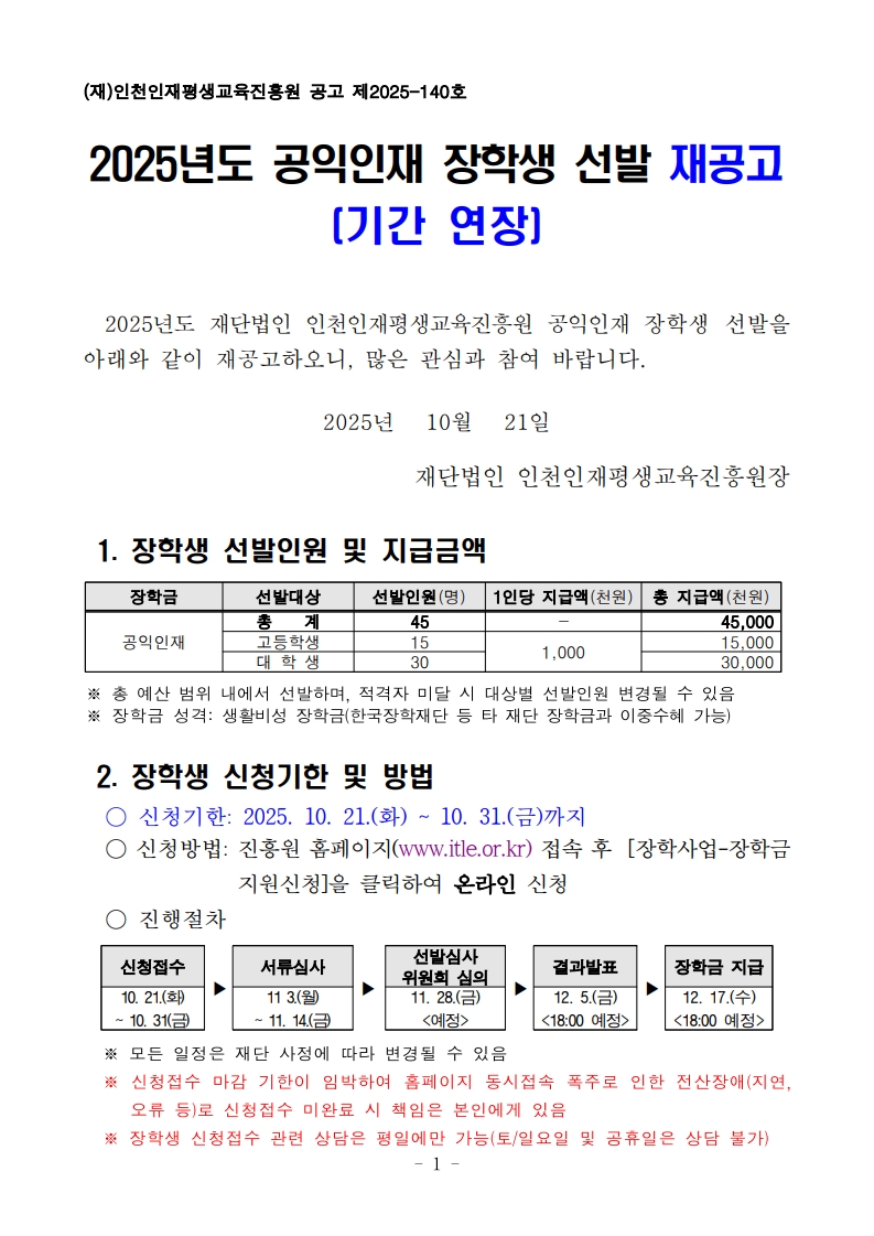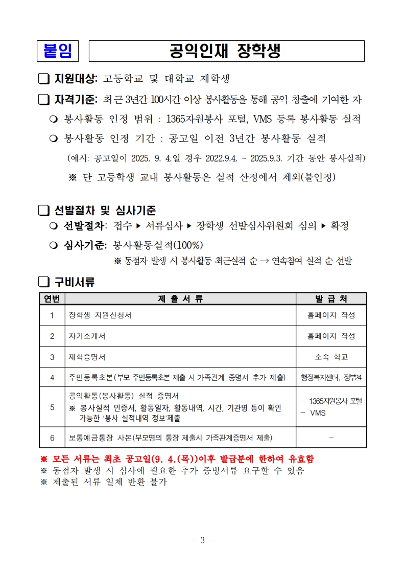| 제목 | 2025년 공익인재 장학생 선발 재공고(기간연장) | ||||